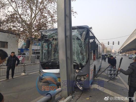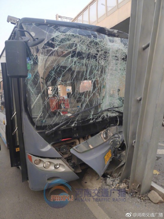 @郑州交巡警五大队 通报,2018年12月23日8时20分,农业路与文化路交叉口发生一起交通事故。驾驶人平某(男,34岁,郑州市人)驾驶一辆豫AP8139公交车,由西向东行驶中因操作不当,撞上高架桥上口的龙门架,事故造成13名乘客不同程度受伤。目前,肇事司机已被警方控制,伤者已经送往医院进行救治,事故正在进一步调查中。