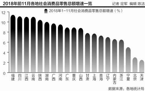 比如,21世纪经济报道记者统计各地统计局数据发现,今年前11个月天津社会消费品零售总额的增速为2.5%,北京为3%,宁夏为5%,增速在全国靠后。而1-11月福建、四川、江西、云南的社会消费品零售总额的增速均达到或超过11%,福建增速甚至达到了11.4%。 为什么这些地区增速较快?21世纪经济报道记者了解到,原因是在这些地区,包括家电、粮油、服装鞋帽、家具、装修装潢等消费都保持了快速增长。这可能与这些地区工业化尚未完成,经济仍快速发展,房地产汽车需求大等有关。 据了解,上述地区的经济增速今年以来在全国靠前。比如今年前三季度福建、江西、云南、四川的经济增速分别为8.3%、8.8%、9.1%、8.1%,均高于全国平均速度。 兰州财经大学金融学院教授委员会主任赵明指出,汽车、房子是大件耐用物品,在经济形势不太明朗,人们预期不太乐观的情况下,不会贸然消费。 他指出,一个地方消费增长快,从根本的决定因素是收入。