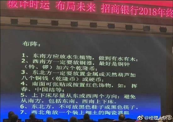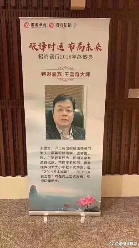 近日有两张图在网上广为流传。一张写着“破译时运,布局未来招商银行2018年终盛典”,然后是特邀嘉宾王雪奇大师的个人简介——“沪上高僧明晹法师关门弟子,常年研修国学,进修史、哲,广览名教经传、民间玄学并亲身试炼,精通星象预测,曾准确做出大大小小数千次预测,如2011日本海啸、2015A股走势……”