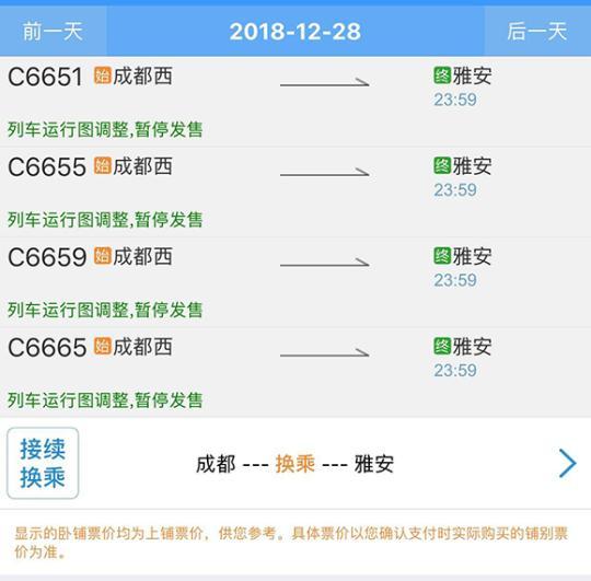 记者查询发现,12月28日成都至雅安将开行c6651、c6655、c6659、c6665四趟动车组。但由于显示“列车运行图调整,暂未发售”,目前还未能查询到更多相关信息,而准确开通信息铁路部门还未正式对外公布。