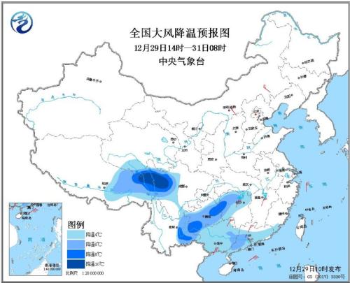 中新网12月29日电 据中央气象台网站消息,中央气象台12月29日10时继续发布寒潮黄色预警,受强冷空气持续影响,29日至31日,青藏高原中东部、云南东部、华南大部等地气温将下降4~8℃,其中,西藏东北部以及湖南西北部、贵州东北部等地的部分地区降温8~10℃,局地超过10℃。