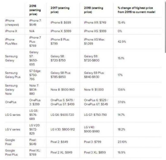 2016年到2018年之间,高端手机价格上涨情况