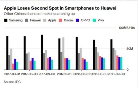 苹果将其在智能手机市场上第二名的宝座拱手让给了华为