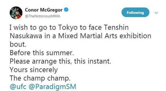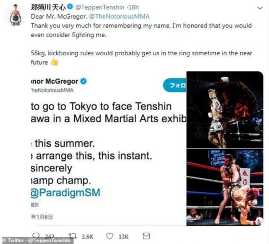 腾讯体育讯 1月9日,前UFC双级别冠军、轻量级MMA巨星“嘴炮”康纳o麦克格雷戈向“日本格斗神童”那须川天心发出约战,嘴炮在个人社交媒体上发文,表示希望和那须川天心在MMA规则下进行一场比赛,并希望在今年夏天以前促成大战。