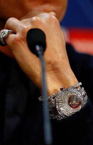 说到C罗佩戴的这块手表,其实也不是第一次入镜了。这块“Jacob&Co”特别订制钻石手表,上面镶嵌有424颗细小钻石,据报道价格为惊人的185万英镑,约合1665万元人民币。在C罗本赛季欧冠面对曼联的客场比赛中就曾引起关注。