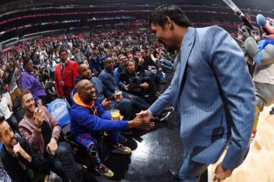 NBA赛场洛杉矶斯台普斯中心正在上演夏洛特黄蜂队和洛杉矶快船队的比赛。在比赛中场休息时,帕奎奥主动走向梅威瑟,弯腰跟梅威瑟打招呼并握手。不知梅威瑟出于什么意图,他连手里的饮料杯都没放下,根本没有起身就坐着对帕奎奥只是微笑了一下握了一下手,一句话也没有,可能帕奎奥感觉无趣,即转身离开。这次偶遇,仿佛是2015年的情景再现:当年正是两人在NBA赛场的一次偶遇,洽谈达成了一致意向,从而打破了持续五年的谈判僵局促成了一番战。