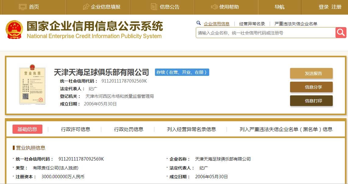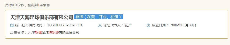 根据国家企业信用信息公示系统显示,权健俱乐部完成了工商更名手续,正式更名为天津天海足球俱乐部。