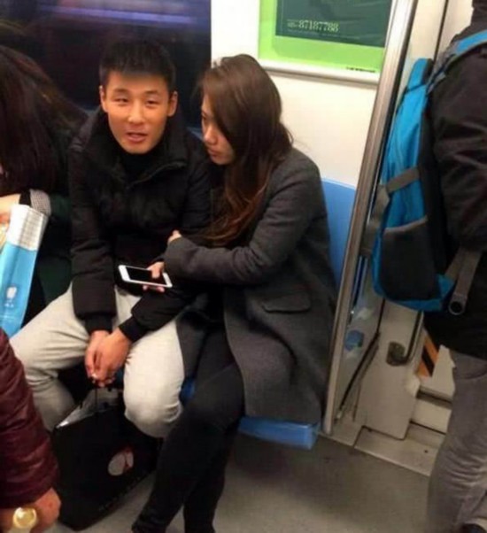 武磊和妻子地铁出行