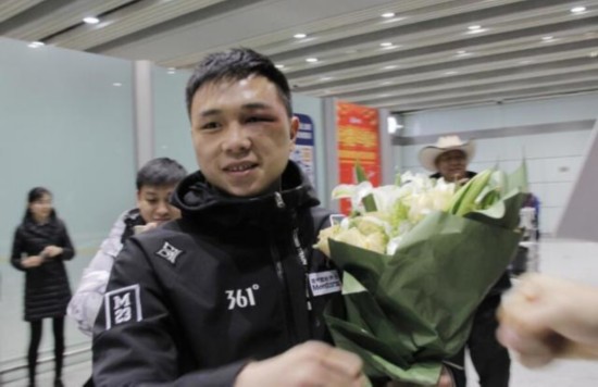 今天上午,徐灿回到了北京,左眼框因为中了罗哈斯的重拳有点黑肿,在飞机上一直冰敷着。因为比赛强度高,一路上徐灿几乎一致在躺着休息。接下来将到拳馆进行恢复训练。