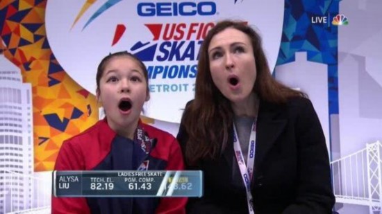 刘美贤和教练看到得分惊讶的表情,这位教练从刘美贤5岁半时就开始指导她。