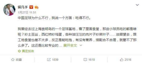 腾讯体育1月30日讯 日前,网络红人“留几手”在社交媒体上发文评中国足球,称中国足球成绩不好的原因在于“吃”,从“吃”的细节就能看出球员职业化程度不高,其他就更不用多说了。