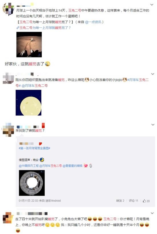 >>“玉兔二号”的独白 大家好,我是你们的玉兔二号,最近听到很多人讨论我怎么总是在睡觉,我知道大家是关心我。 可我。。。我有点小委屈,我真的不是只懒惰的兔子呀! “明明我起得更早嘛” 公元2019年1月29日,本兔,睡醒啦。 我知道你们一定在想,不是今天吗?