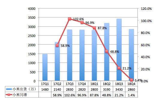 2018年第二季度,小米手机出货量同比增长降至48.8%,第三季度小米出货量增长再度下降至21.2%,到了第四季度其同比增速仅为1.4%。也就是说,小米手机已经陷入了增长瓶颈期。