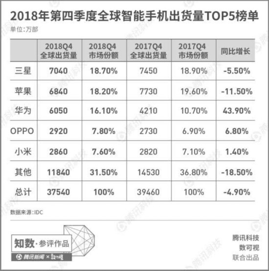 实际上,如今的全球智能手机市场,不仅仅是小米面临来自华为的激烈竞争,三星和苹果也被华为挤走不少市场份额,这两家公司的数据比小米还要糟糕,因为三星和苹果在2018年第四季度都是负增长,只有华为一家增长43.9%,冠绝全球。