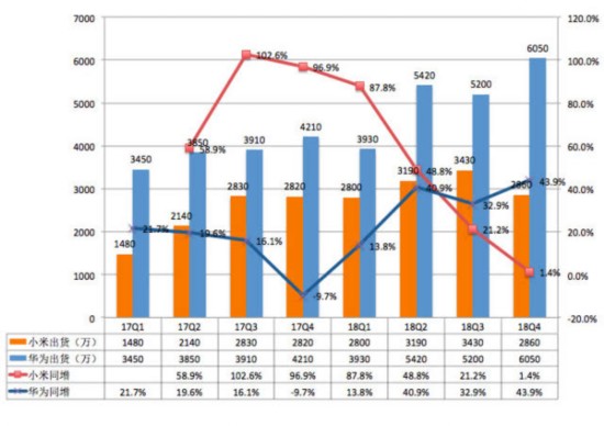 进入2018年以来,天平开始朝有利于华为的方向倾斜。在2018年第三季度前的连续5个季度,小米的增速均高于华为,但到了2018年第三季度,华为增速反超小米,自此两家公司的增速差距越来越大,到第四季度小米几乎已经不再增长了,而华为的增速则高达43.9%。