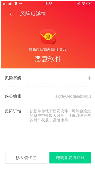 市民王阿姨为抢红包下载了一款叫做“最强抢红包神器”的应用,登录后却发现是一款赌博软件,知道被骗后,王阿姨立刻卸载了软件。原来,王阿姨下载的“最强抢红包神器”是一款地下博彩软件,通过伪装成“抢红包神器”诱导用户下载。该软件携带一种名为“a.gray.redgambling.a”的病毒,可能给用户的财产带来较大风险,而且在用户财产损失后,难以维权。