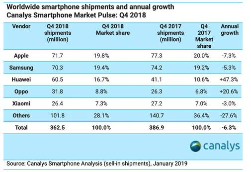 【环球网科技综合报道】外媒BusinessToday1月30日消息,市场研究公司Canalys发布报告称,尽管iPhone销售放缓拖累了苹果截至2018年12月29日的财年营收,但苹果仍在2018年第四季度超过三星,成为全球最大的手机销售商。苹果iPhone该季度出货量为7,170万部,而三星则为7,030万部,两者都有下滑。同时华为和OPPO的出货量实现了增长,分别为6050万部和3180万部。