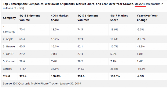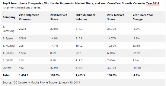 【环球网科技综合报道】1月30日,IDC发布全球季度智能手机追踪报告,公布2018年第四季度数据的同时,IDC也放出了2018年全年的排行:三星、苹果、华为、小米和OPPO位居前五。