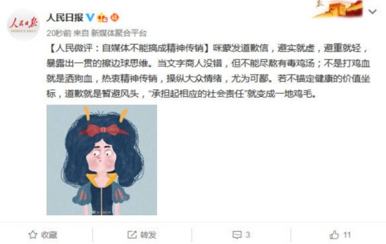 咪蒙发道歉信,避实就虚,避重就轻,暴露出一贯的擦边球思维。当文字商人没错,但不能尽熬有毒鸡汤;不是打鸡血就是洒狗血,热衷精神传销,操纵大众情绪,尤为可鄙。若不锚定健康的价值坐标,道歉就是暂避风头,“承担起相应的社会责任”就变成一地鸡毛。
