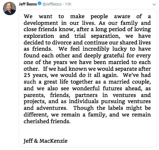 1月9日周三,拥有逾千亿美元身家的亿万富豪贝索斯在推特上发布声明称,“正如我们的家人和亲密的朋友所知,经过长时间的爱心探索和尝试分居后,我们决定离婚,并继续作为朋友共同生活。”