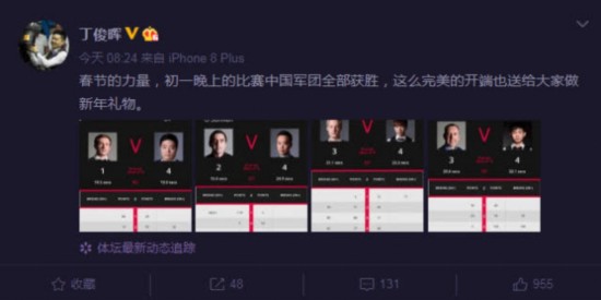 丁俊晖在微博里高兴的表示:“春节的力量,初一晚上的比赛中国军团全部获胜,这么完美的开端也送给大家做新年礼物。”