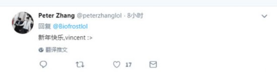 Peter Zhang和Biofrost则用中文送上祝福。Biofrost为LCS赛区CLG战队辅助选手,CLG目前以2-2的战绩暂居联赛第三名。Peter Zhang作为LCS次级联赛的华裔教练,可能大家比较陌生,但如果S4就关注职业比赛的观众应该还能记得,Peter Zhang带领5名中国小伙子组成的LMQ战队打入北美联赛,实现了三级跳,闯进世界赛,但最终遗憾止步16强。如今Peter Zhang是北美联赛TSM二队的教练。