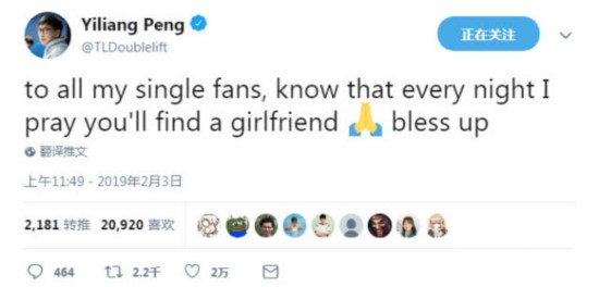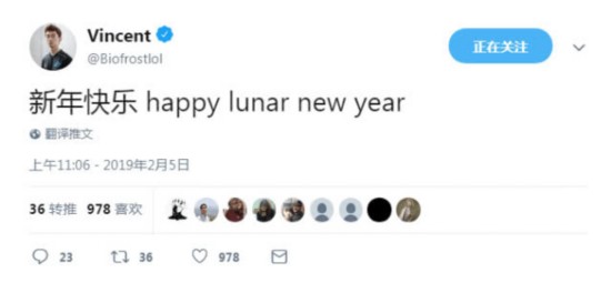 北美LCS赛区知名华裔选手Doublelift、Biofrost以及华裔教练Peter Zhang,也在Twitter发文为大家拜年。Doublelift言简意赅:“新春快乐。”Doublelift,被中国网友亲切的称为“大师兄”,可能是北美赛区最受中国观众熟知的选手了,所在的TL战队现如今以4-0的战绩暂居LCS榜首。