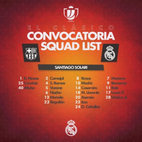 腾讯体育2月6日讯 西甲豪门皇马公布客场面对巴萨的国王杯半决赛首回合21人大名单,本泽马、贝尔、莫德里奇等主力领衔,伊斯科和解禁的卡瓦哈尔、瓦拉内悉数入选。