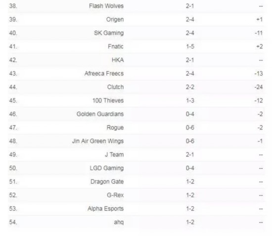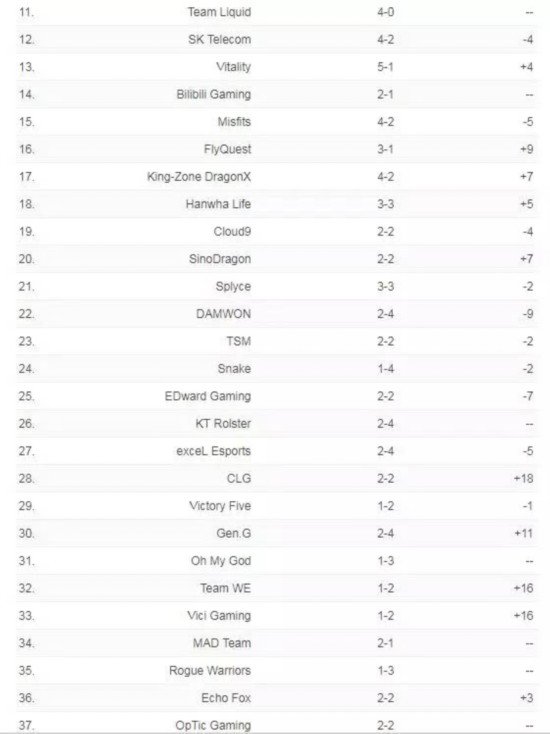 被GRF碾压之后的SKT下跌到12名,败给WE的EDG则来到了25名。