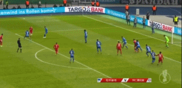 加时赛第98分钟,基米希大禁区左侧传中,格雷茨卡争下第一落点,莱万多夫斯基机警的插上抢在门将出击之前倒钩送出挑传,科曼在对方三名后卫的包夹下头球破门,凭借此球拜仁艰难的拿到了德国杯八强的门票。