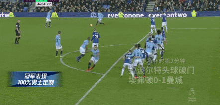 进入上半场伤停补时,正当场下的球迷准备离场休息上厕所时,埃弗顿的防守精力也随着球迷下了场,不幸被那位老埃弗顿球迷言中,盯人不紧,拉波尔特接大卫席尔瓦开出的任意球头槌建功,半场结束曼城1:0领先。