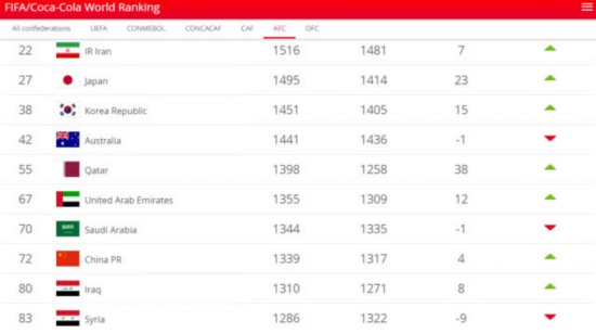 在亚洲杯八强赛淘汰了国足的伊朗队,依然位列亚洲头名,波斯铁骑积分增加35分,排名提升了7位,总排名提升至第22位。获得亚军的日本队列亚洲第二,总排名第27位;韩国队和澳大利亚队分列亚洲第三、四位。