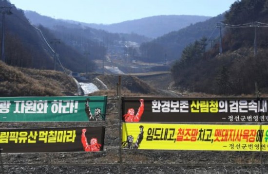 这张照片摄于2019年1月25日,展示了民众要求开发奥运遗产的抗议横幅。该中心在平昌冬奥会期间举行了高山滑雪项目。