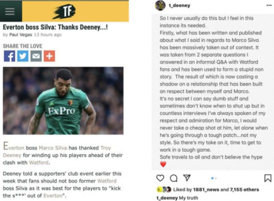 故事的头号主角是现任埃弗顿主帅马科.席尔瓦,他可以说和沃特福德有着一连串的恩怨情仇。上个赛季他还是沃特福德的主帅,在上赛季中期阿勒代斯下课后,传出各种和埃弗顿私下接触(之后也被英超官方证实为真)的行为,并在很短的时间内向俱乐部递交了跳槽申请,虽然和沃特福德管理层沟通后决定赛季结束后再离开但是却开始在战绩上摆烂,导致赛季初期猛如虎甚至长时间盘踞前十的大黄蜂在赛季末以临近降级区的成绩收尾。