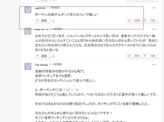 在日本雅虎报道四大洲赛男单结果的跟贴后,有日本网友留言称,“博洋的状态好象上来了,真为他开心!”这条留言四个小时内收集到了993个赞,目前高居跟贴榜第五。