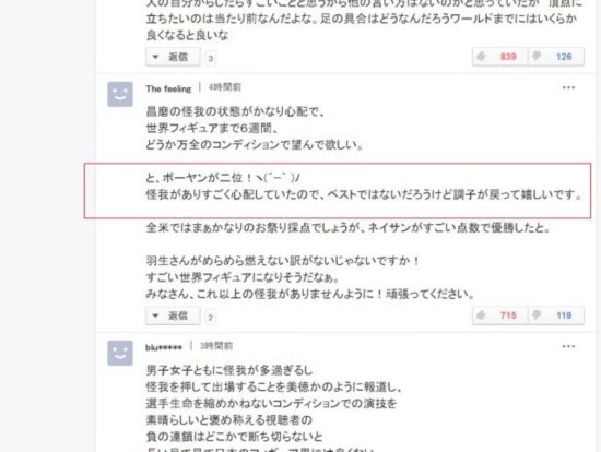 这名网友还谆谆叮嘱宇野昌磨和金博洋都千万注意,不要再受伤,“因为距离世锦赛只有6周了,请务必以万全的状态迎战世锦赛。”这条跟贴同样在四小时内收集到了698个赞,高居跟贴榜第七。