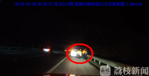 2月9日晚上8点半左右,盐城交警支队高速二大队民警沿沈海高速由北向南巡查到980号桩附近时,发现一辆轿车停在应急车道里,没有摆放任何警示标志,在车后面,还有几个人扭打在一起,而旁边的车道里就是滚滚的返程车流。