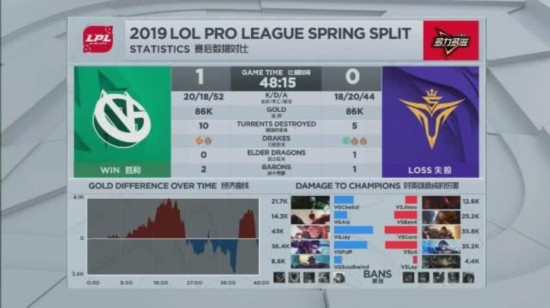 腾讯体育讯 北京时间2月19日,2019英雄联盟LPL春季赛常规赛继续进行。第一场比赛,由VG对阵联赛新军V5。比赛第一局,V5酒桶前期的节奏更加完美,但VG凭着一波击杀四人的团战扭转局面,把劣势的比赛拖入后期,最终VG击败V5,拿下首局。