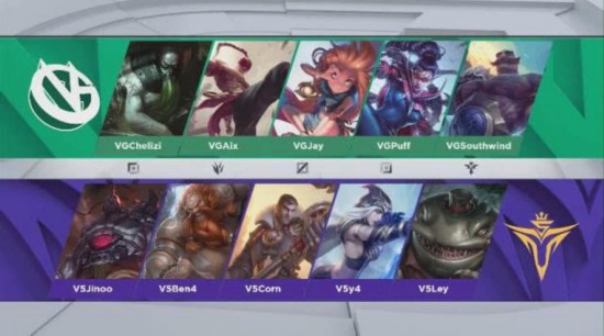 VG:上单 Chelizi(夏涵玺)、打野 Aix(李阳)、中单 Jay(陈波)、ADC Puff(丁旺)、辅助 Southwind(苏志林)