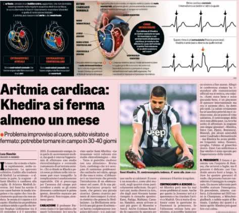 赫迪拉的伤情到底如何,意大利的《米兰体育报》进行了分析,这家媒体图解了赫迪拉心脏问题,并表示赫迪拉的心率失常可以通过药物治疗,也可以通过心脏射频消融手术(通过手术将导引线经由血管插入心脏消除心律不齐)来解决,但是这一病情需要时间恢复,这家媒体称,赫迪拉可能至少缺阵一个月。