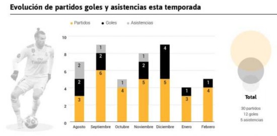 11月7日对比尔森胜利一战,贝尔送出了1次助攻,这是他11月送出的唯一一次助攻,而在12月、1月和2月,他再也没有送出助攻。在12月,威尔士人5场打入4球,然而,其中3球是在对鹿岛鹿角的世俱杯半决赛里打入。这意味着,除了世俱杯半决赛之外,从12月以来,威尔士边锋12次出场仅仅打入了3球,其效率显然不够出色。