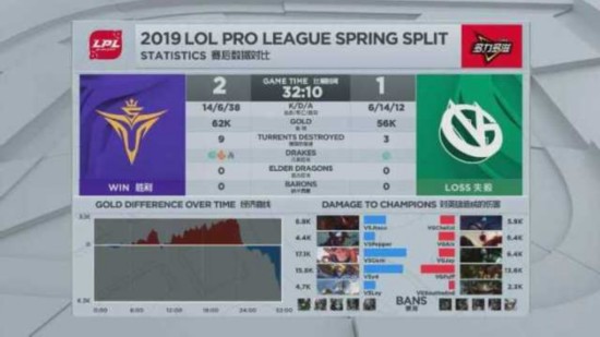 20分钟,武器单人带掉V5下路一塔。24分钟,VG集合四人之力拿下水龙。随后武器TP绕后开团,V5果断反打打出一波二换四。并推掉中路高地。30分钟,双方上路交锋,盲僧果断回旋踢回佐伊,但自己被集火秒杀,随后V5中路一波直接带走比赛。