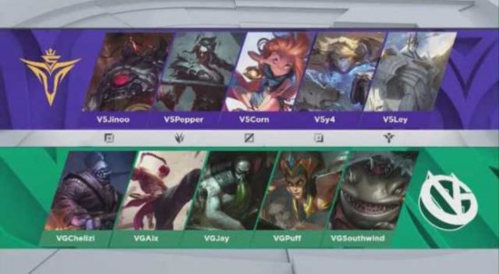 VG:上单 Chelizi(夏涵玺)、打野 Aix(李阳)、中单 Jay(陈波)、ADC Puff(丁旺)、辅助 Southwind(苏志林)