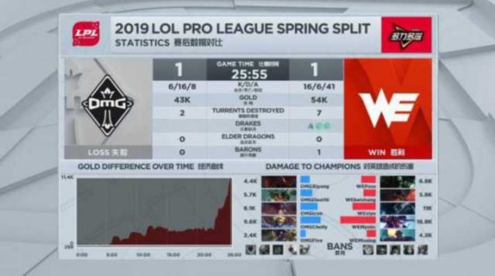 比赛后期,WE五人带着大龙BUFF抱团打上高地,OMG无力回天被团灭 。WE拿下第二局比赛胜利。