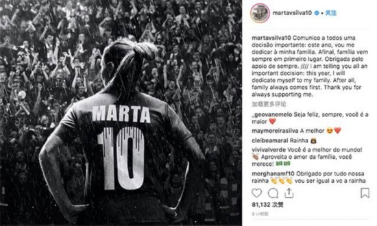 在个人社交平台上,玛塔写道:“在这里,我将向各位宣布一个重要决定:今年我将专注于家庭生活,对我来说家人永远是第一位的。感谢大家一直以来对我的支持。”玛塔目前所效力球队、美国职业大联盟的奥兰多荣耀女足在官方社交平台上善意的开出了玩笑,“大家都知道,我们就是你的家人。”