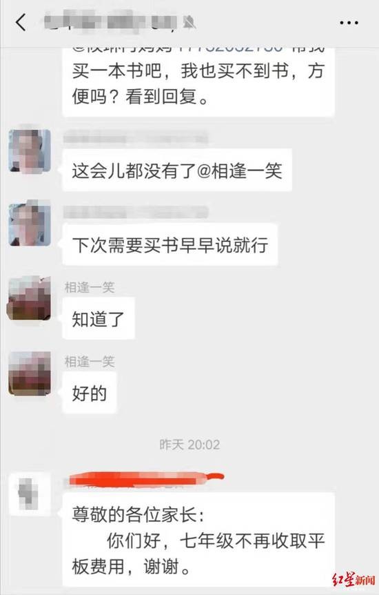 多名家长告诉红星新闻记者,昨晚,他们在微信群里收到老师通知,称“七年级不再收取平板费用”。家长称,他们向老师询问后,得知学校将不再开展平板教学。