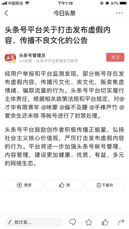 今日中午,头条号管理员发布《头条号平台关于打击发布虚假内容、传播不良文化的公告》: