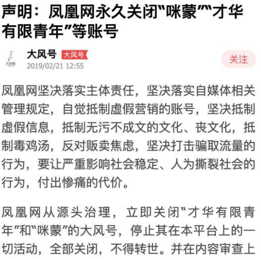 凤凰网从源头治理,立即关闭“才华有限青年”和“咪蒙”的大风号,停止其在本平台上的一切活动,全部关闭,不得转世。并在内容审查上严格把关,严格审核,牢牢守住秩序红线,严禁任何虚假、低俗内容越线一步,同时还要加强监管,发现一处查处一处,整改一处,杜绝一处,让严查细审成为网络治理的常态。