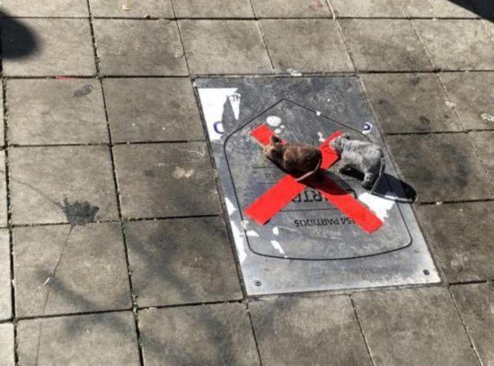 印有库尔图瓦名字的铭牌被打上红叉摆上老鼠,在西班牙足球文化老鼠意味着叛徒