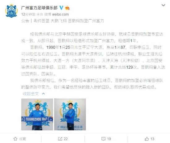 经我俱乐部与北京中赫国安足球俱乐部友好协商,就球员晋鹏翔加盟事宜达成一致,从即日起,晋鹏翔以租借形式加盟广州富力,租借期1年。
